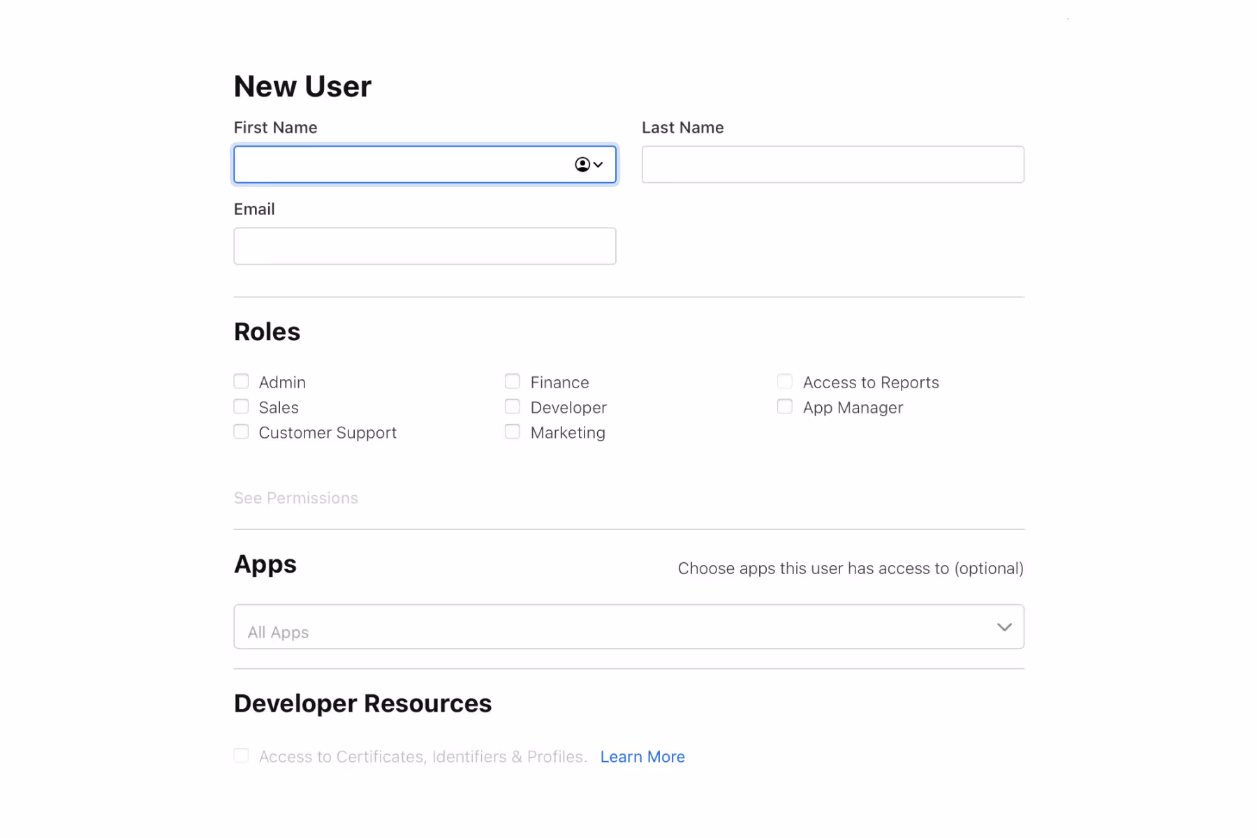 In the Roles section, select Admin to allow the user to manage your apps as well as other users (including members of the development team) in your account. If you are not comfortable granting Admin access, App Manager is the lowest-level role that will still allow app development teams to create new apps for you in your account.